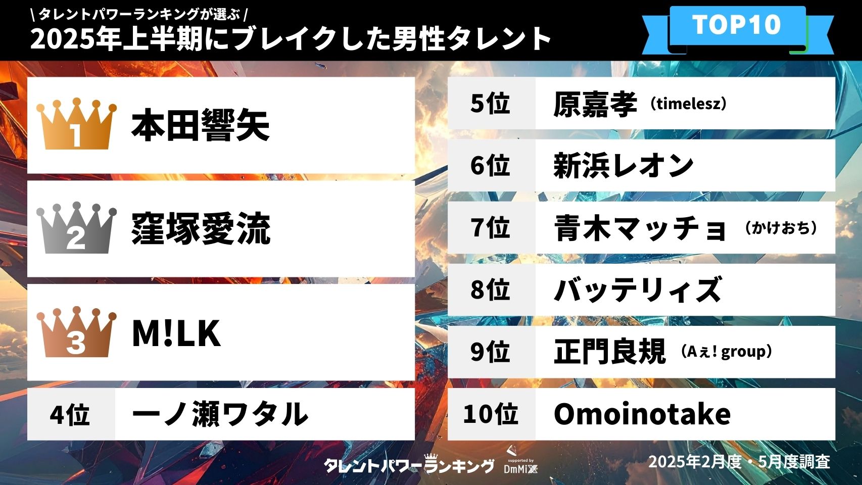 タレントパワーランキングが選ぶ2025年下半期にブレイクした男性タレント・女性タレントTOP10