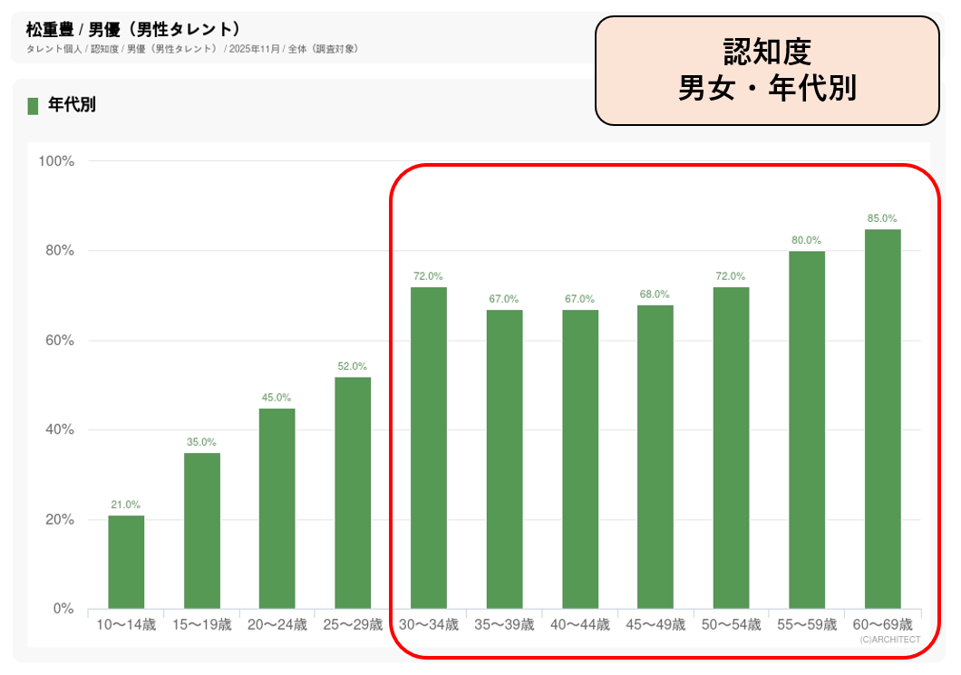 11月度調査では60代男優4位。年代別に見ると、30代から60代を中心に幅広い年齢層で支持されています。誘引率は60代男優3位(1位・光石研、2位・阿部寛)で、世間の関心度・好感度の高さがうかがえます。 不動産情報サイト「アットホーム」のCMには2022年から出演。2024年12月からイメージキャラクターに加わった女優の出口夏希が賃貸物件情報をメインとしたバージョンに出演して若い層にアピールしているのに対し、松重は2025年10月から放送開始となった注文住宅の検討をテーマにした“注文住宅サイト探索”新発見篇に『ウォーリーを探せ』のキャラクター「ウォーリー」とともに出演しています。ターゲットとなる30代以上での認知度の高さが、CM起用につながっていると推測されます。
