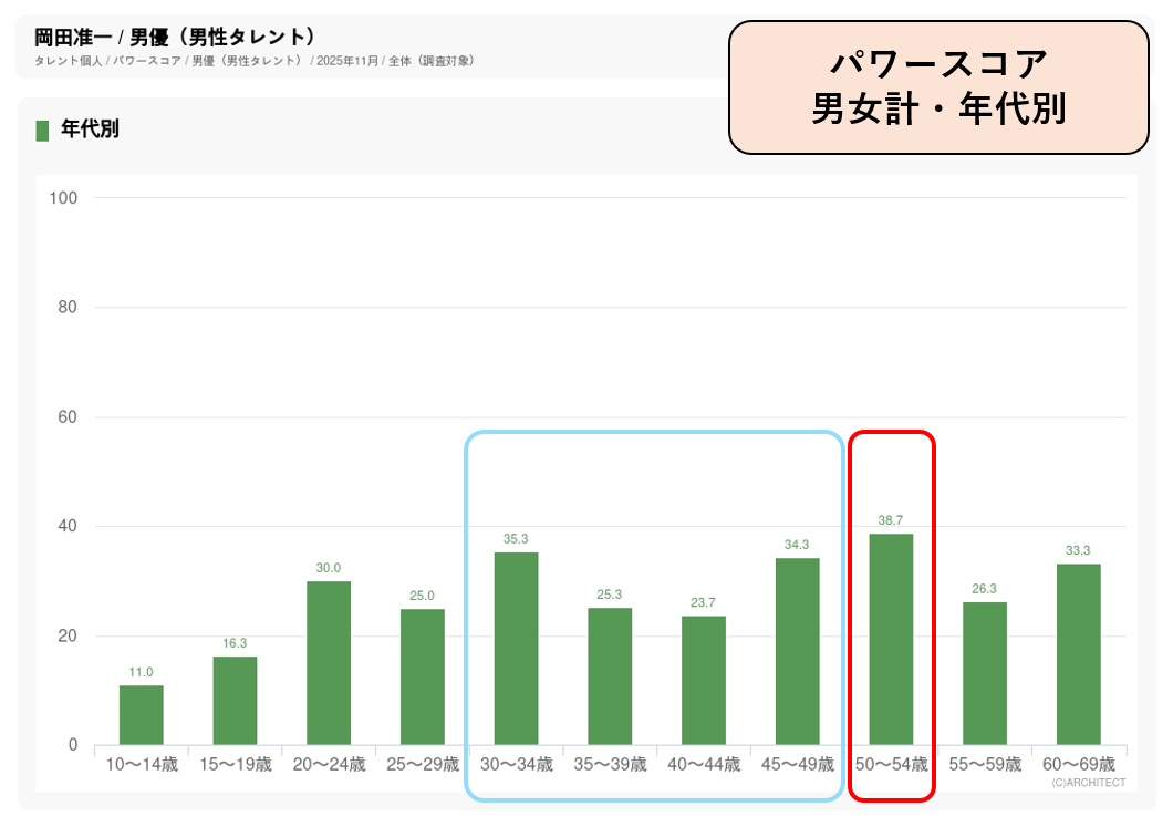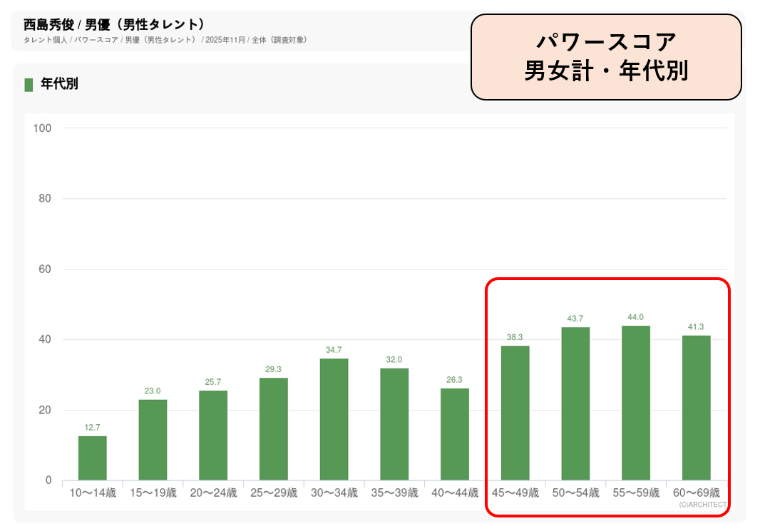 2022年から大手住宅メーカー「大和ハウス工業」の企業CMでヒーローキャラクター「ダイワマン」を演じています(2009~2011年に役所広司が演じていたシリーズのSeason2)。11月度調査で50代男優5位にランクイン。認知度では50代男優14位ですが、誘引率は4位で50代男優上位4名を上回っています。40代後半から60代のパワースコアが高く、年配層での人気がハウスメーカーのターゲットと合致しています。