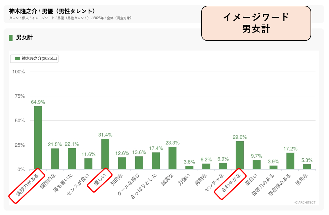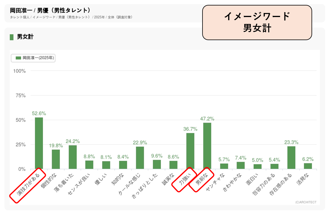 東急グループの不動産会社「東急リバブル」が創立50周年を迎えた2022年からCMに出演して、不動産のプロとして奮闘する営業マンを演じています。年代別パワースコアでは50代前半のスコアが最も高く、30代・40代でも高いスコアを示していることから、新築販売仲介をメインとした同社のイメージに合致したと考えられます。 イメージワード調査では「演技力がある」「男前な」「力強い」の3つのワードの割合が高く、信頼できる営業マンの姿を力強く演じているお仕事ドラマ風のCM内容になったことがうなずけます。