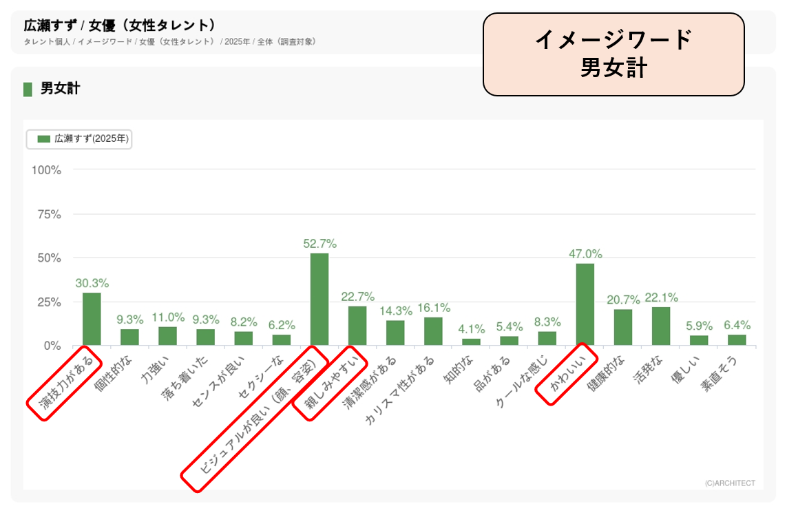 また、イメージデータ調査では、タレントのジャンルごとに決められているイメージワードから選ぶ方法によって、そのタレントがどのようなイメージを持たれているかを年に1回調査しています。