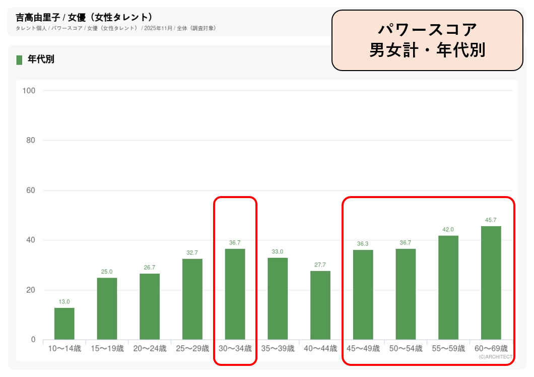 株式会社アーキテクトでは年に4回(2月/5月/8月/11月)、毎回男女10~69歳の合計4400人に回答を依頼しています。調査しているのは「認知度」(そのタレントを知っているかどうかの数値)、「誘引率」(「知っている」と答えた人に対して、そのタレントがドラマやCMに出ていて観たいと思うかどうかの数値)で、「認知度」と「誘引率」を掛け合わせて、そのタレントが、どれだけの人たちを惹きつけているか、「人気度」を示す弊社独自の指標「パワースコア」を算出します。