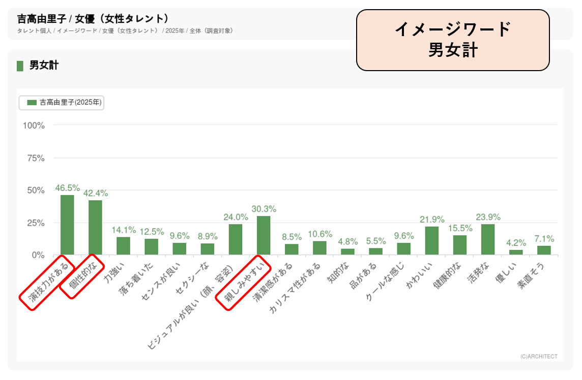 総合不動産デベロッパー「三菱地所」の企業CMシリーズ「三菱地所と次に行こう」に2018年から出演。2025年8月に放映開始された最新CM「東京駅前丸の内篇」「プレミアム・アウトレット篇」ではクイズ形式の歌をフューチャーして、歌唱力に定評がある高畑充希の魅力を活かしています。イメージワード調査ではもっともスコアが高いのが「演技力がある」で、次いで「親しみやすい」が高くなっています。この2つのワードは三井不動産のCMに出演する広瀬すずも高い数値を示しており、デベロッパーのCMに起用されるタレントのポイントと言えます。