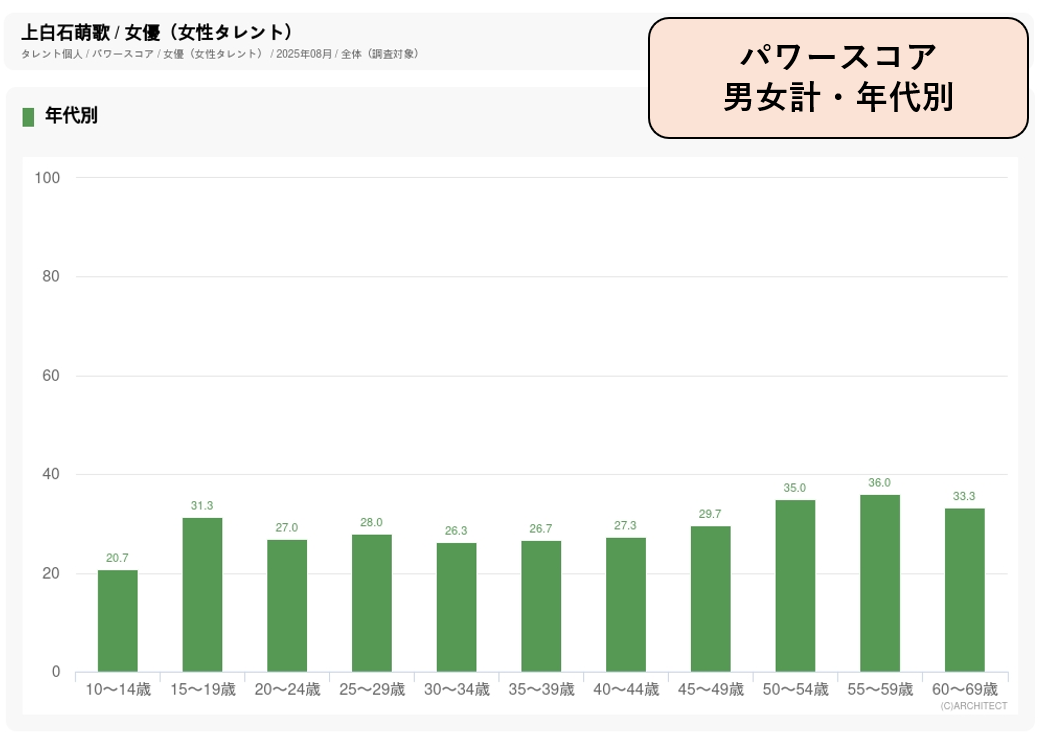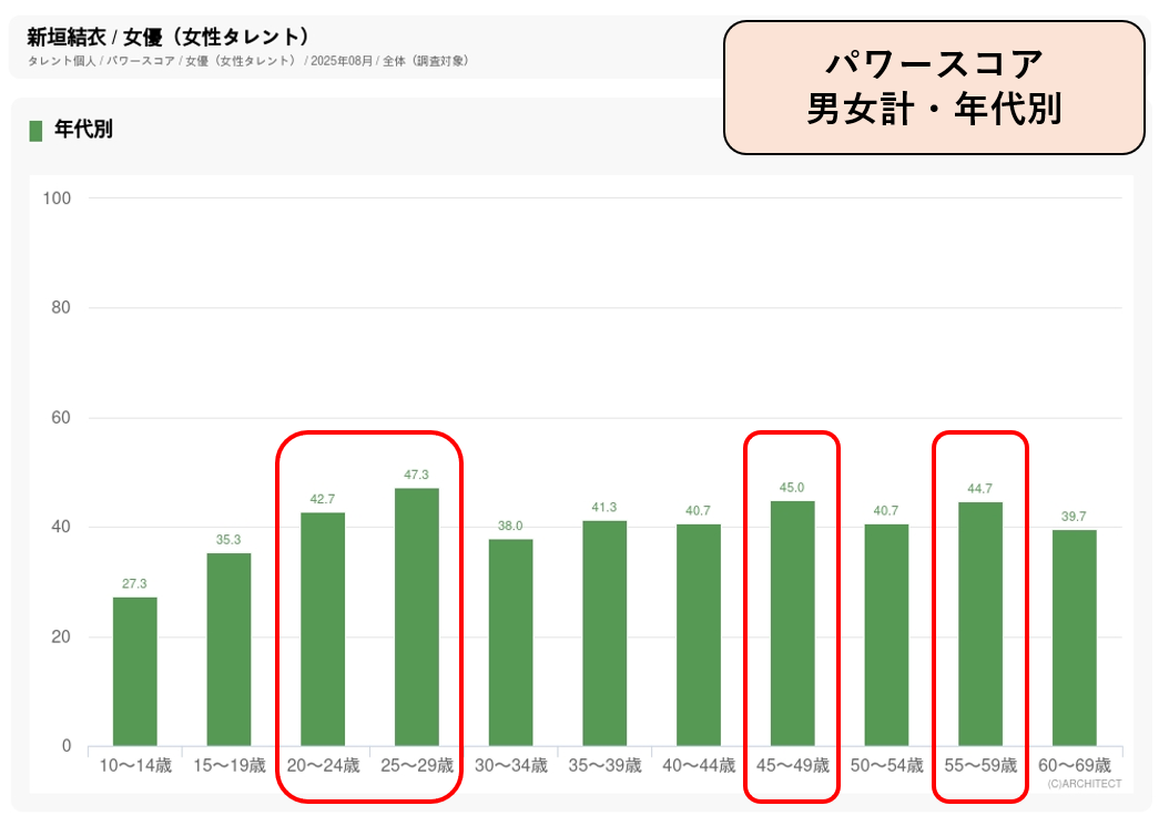 株式会社アーキテクトでは年に4回(2月/5月/8月/11月)、毎回男女10~69歳の合計4400人に回答を依頼しています。調査しているのは「認知度」(そのタレントを知っているかどうかの数値)、「誘引率」(「知っている」と答えた人に対して、そのタレントがドラマやCMに出ていて観たいと思うかどうかの数値)で、「認知度」と「誘引率」を掛け合わせて、そのタレントが、どれだけの人たちを惹きつけているか、「人気度」を示す弊社独自の指標「パワースコア」を算出します。