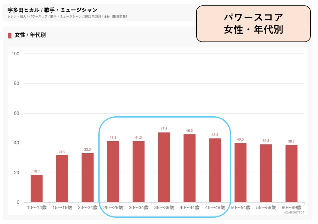 パワースコアは、20代後半から40代後半まで幅広い年代で高くなっています。特にスコアが高いのは、30代後半から40代後半にかけての女性ですが、20代後半・30代前半も高いスコアを示しています。2024年からアンバサダーに就任してCMに出演するとともにCMソングも担当している「綾鷹」は、同年のフルリニューアルによって商品のターゲットをそれまでの40~50代から20~30代に変更しました。サブスクサービスの普及で若い層においても宇多田ヒカルの楽曲が支持されていることが、CM起用の要因になったのではないでしょうか。