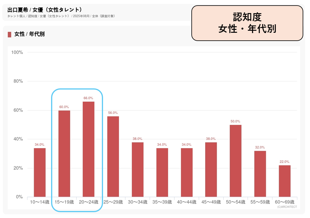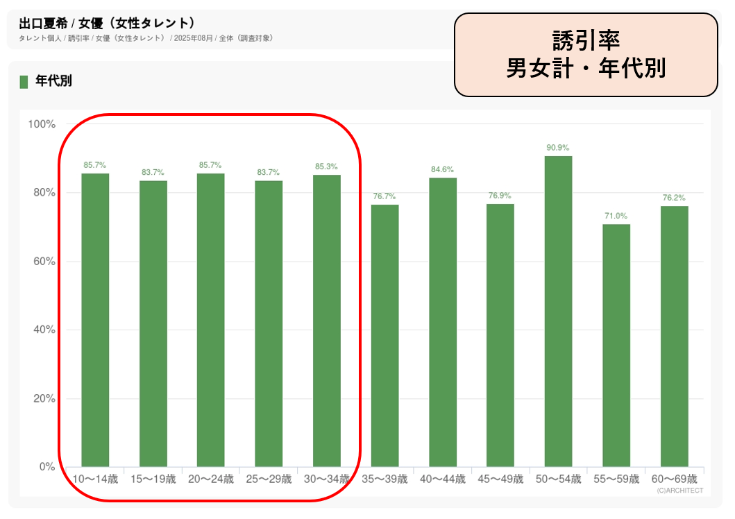 CM起用が増えている次世代女優で、「もっと見たい」という関心の高さを示す誘引率は10代から30代前半まで、いずれも80%を上回っています。これまで松嶋菜々子、綾瀬はるか、北川景子、満島ひかりらの女優が出演してきたキリン「生茶」のCMに、2024年から新規起用されました。『Seventeen』『non-no』専属モデルとして活躍してきたことから10代後半、20代前半の女性の認知度が高く、イメージワードでは、「ビジュアルが良い」「かわいい」に次いで「清潔感がある」「親しみやすい」のスコアが高くなっています。お茶が持つ清涼感を的確に表現できて、若年層に訴求する旬の若手女優としての起用と考えられます。