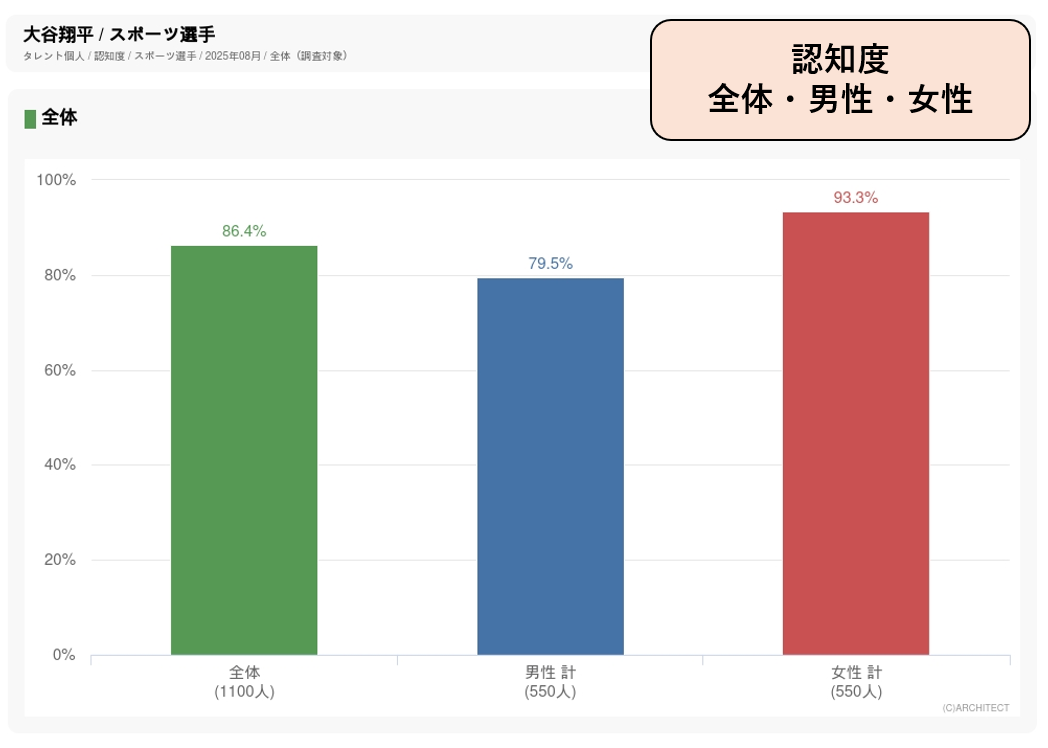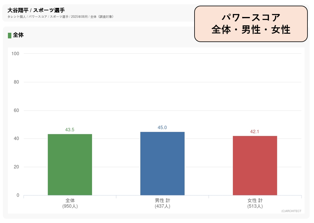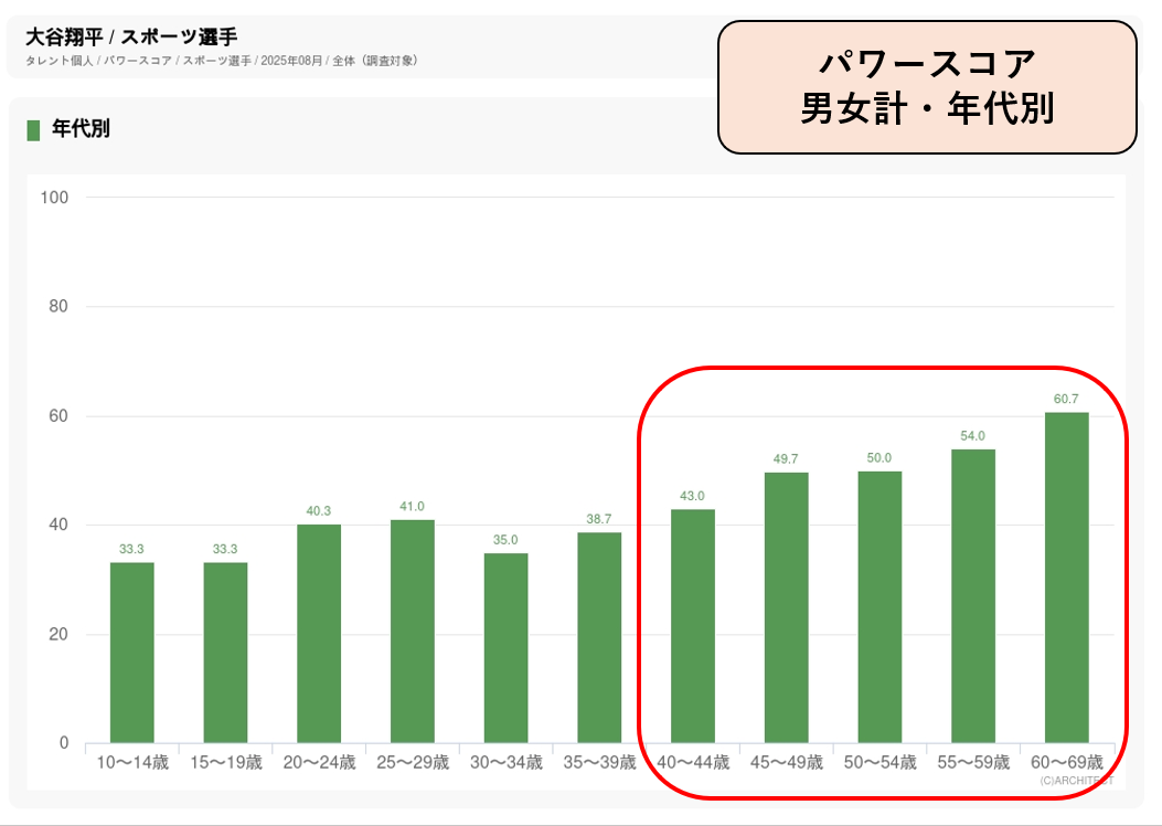 連日ニュースやワイドショーでも取りあげられていることから幅広い年代でパワースコアが高く、8月度調査で総合2位となっています(1位はサンドウィッチマン)。野球選手は男性の回答者のほうが認知度やパワースコアが高くなる傾向がありますが、大谷の場合はパワースコアが男女ほぼ同じで、認知度は男性79.5%に対して女性93.3%で女性のほうが高くなっています。年代別に見ると特にパワースコアが高いのは40~60代で、ほかのお茶飲料と比べて40代以上の支持が高くなっている「お~いお茶」のコアターゲット層に合致した人気者の起用となっています。
