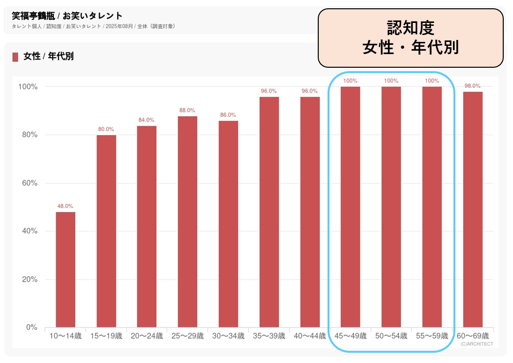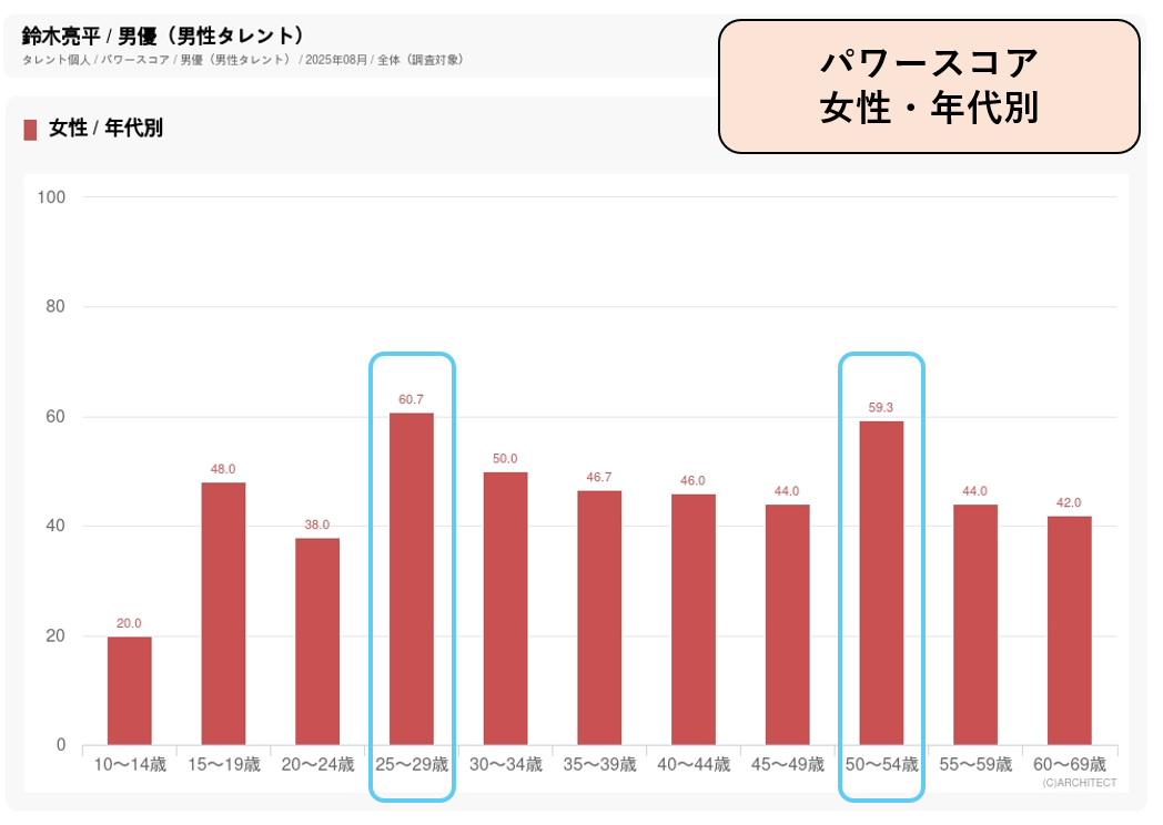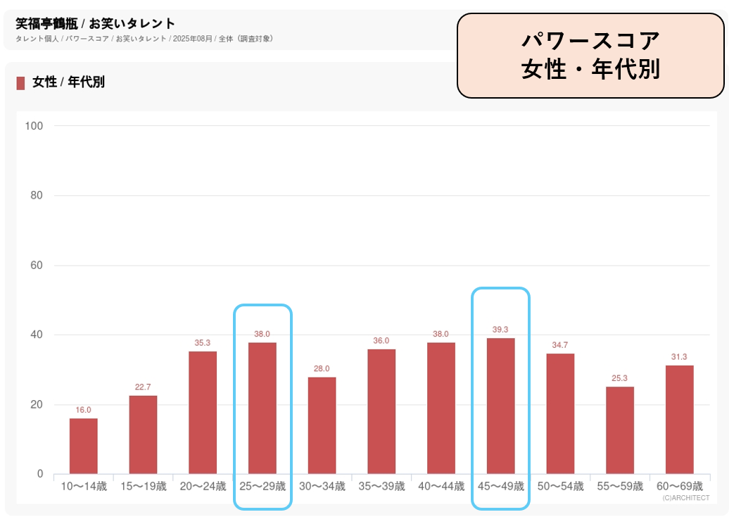 NHKの人気番組で活躍してきたこともあって中高年での知名度が抜群に高く、特に40代後半、50代前半・後半女性の認知度は100%です。年代別パワースコアでは、40代後半女性の39.3ポイントがトップですが、20代後半女性でもこれに匹敵する38.0ポイントの高スコアをはじき出しています。健康志向から市場を拡大している麦茶はお茶飲料の中では女性の支持が高く、幅広い年代で女性人気が高い笑福亭鶴瓶が起用された要因になっていると見られます。