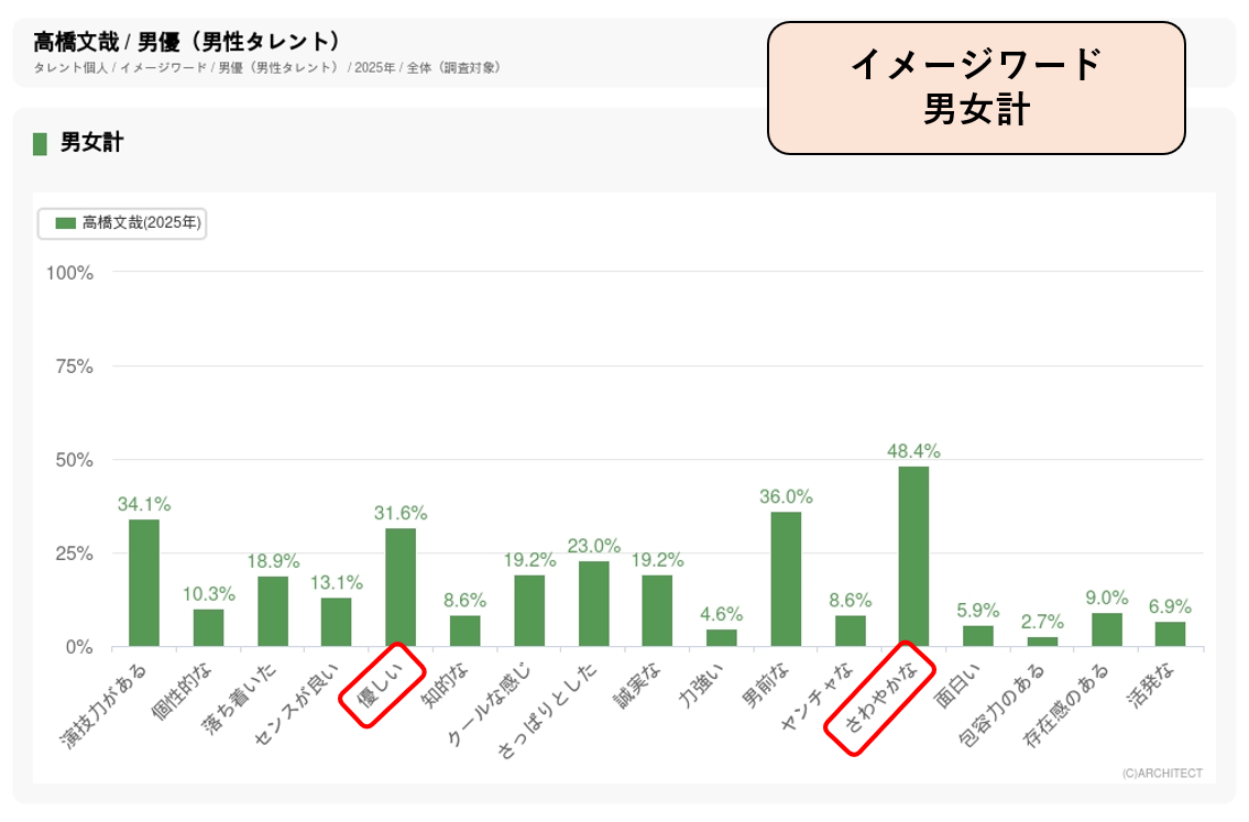 2025年4月からスタートした「やかんの麦茶」の新CMはアニメ『クレヨンしんちゃん』の実写化企画で、高橋文哉は「25歳になった野原しんのすけ」役を演じています。10代後半から20代後半でパワースコアが高い高橋が、商品のターゲットである20~40代に認知が高い『クレヨンしんちゃん』とコラボすることで、効果的なアピールを狙っています。イメージワード調査で「さわやかな」「優しい」の数値が高いことも、麦茶のCMに起用された要因となったと考えられます。