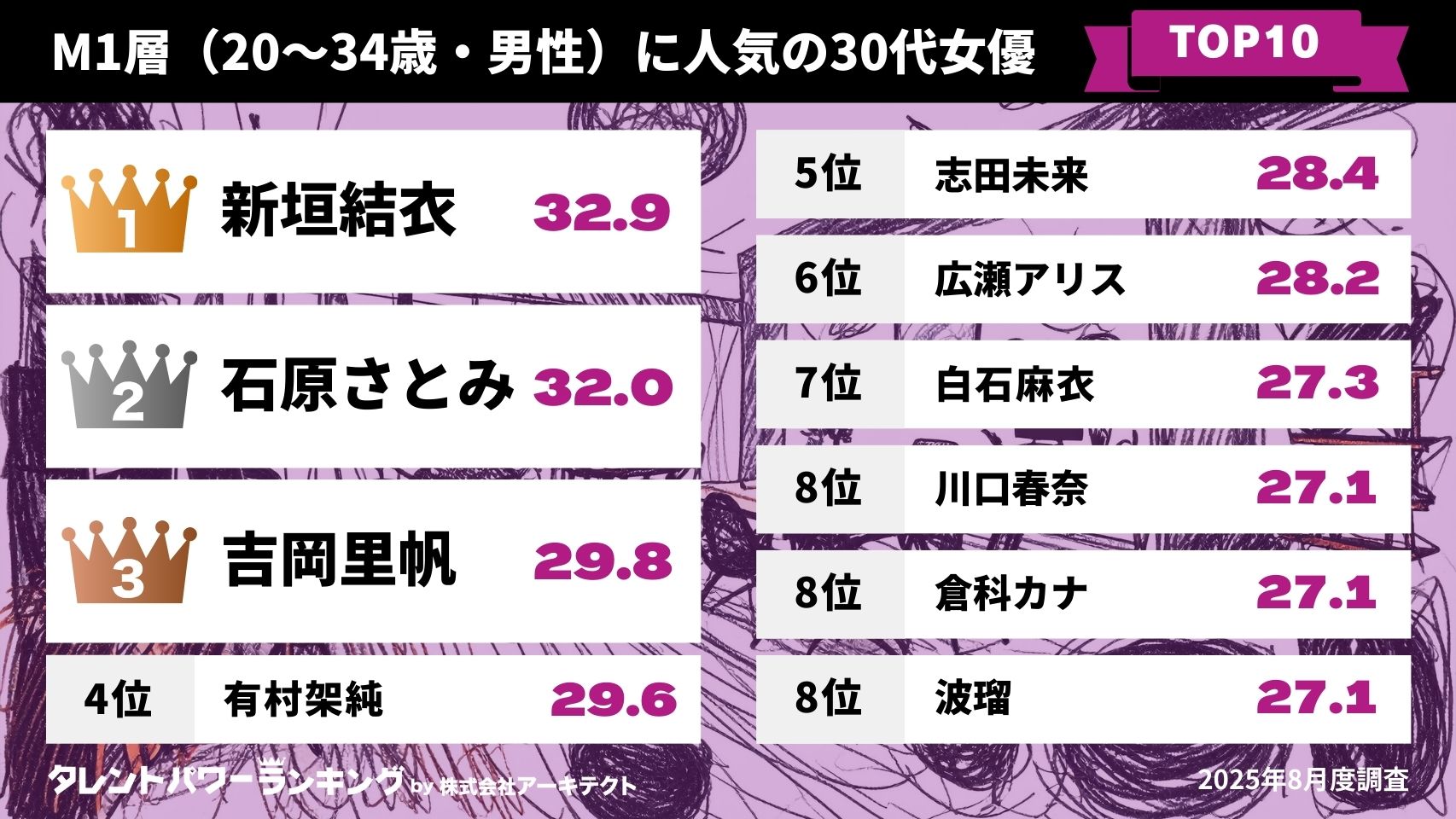【2025年版】M1層とF1層における30代女優各TOP10比較