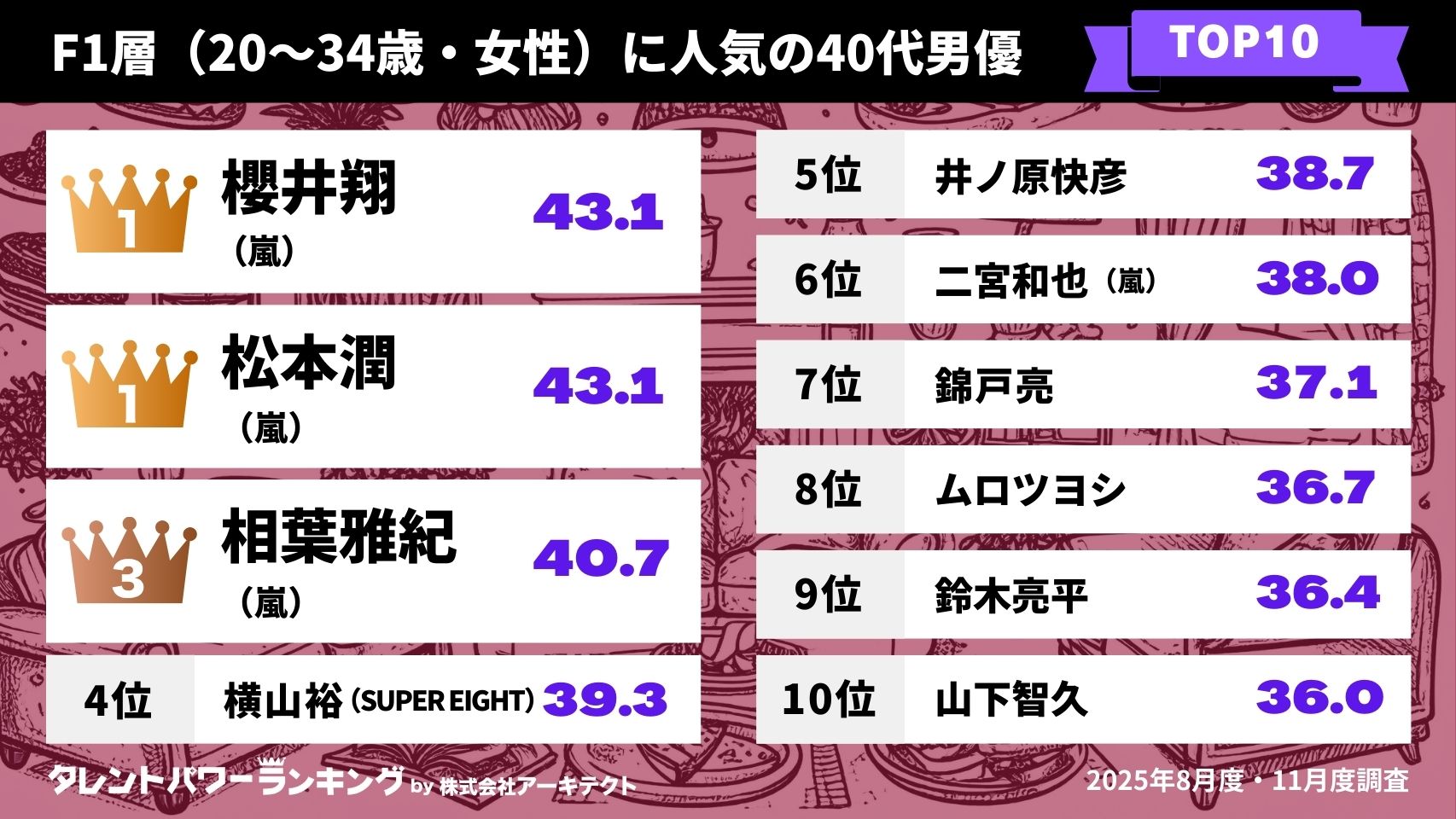株式会社アーキテクトが実施しているタレントパワーランキングの定期調査で、調査対象として登録されている40~49歳男優の中でM1層(20~34歳男性)とF1層(20~34歳女性)のそれぞれの回答においてパワースコアが高かった順にランキング化しました。タレントの年齢は2026年2月15日時点です。