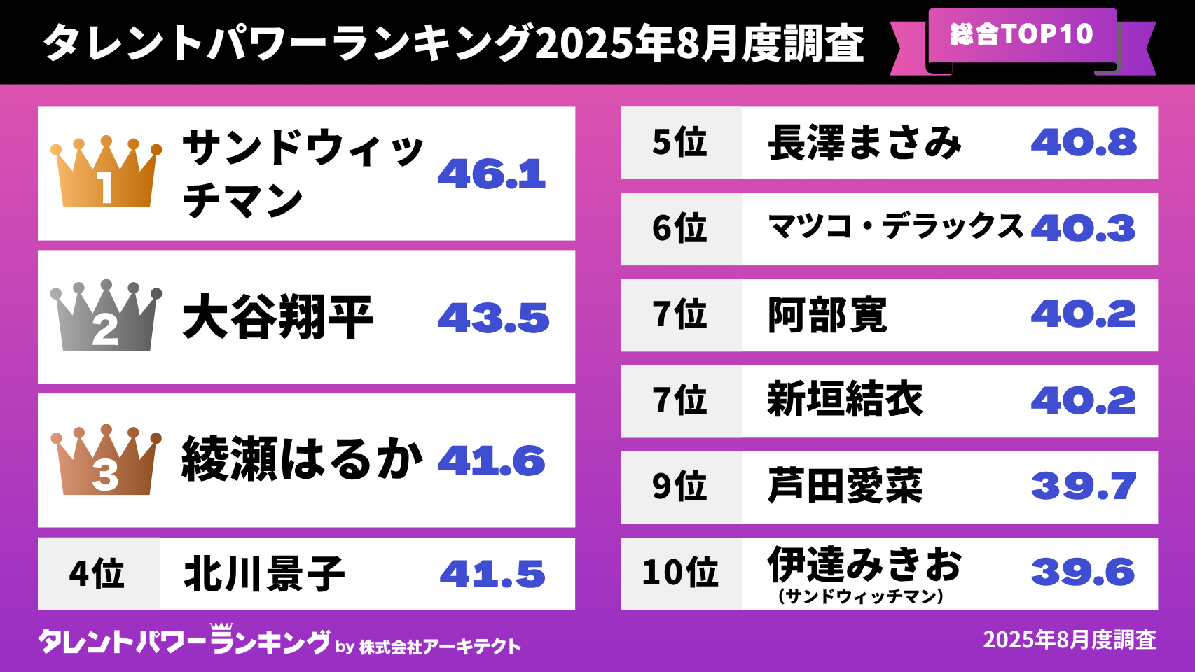 「タレントパワーランキング」2025年8月度調査(第3四半期)総合トップ10