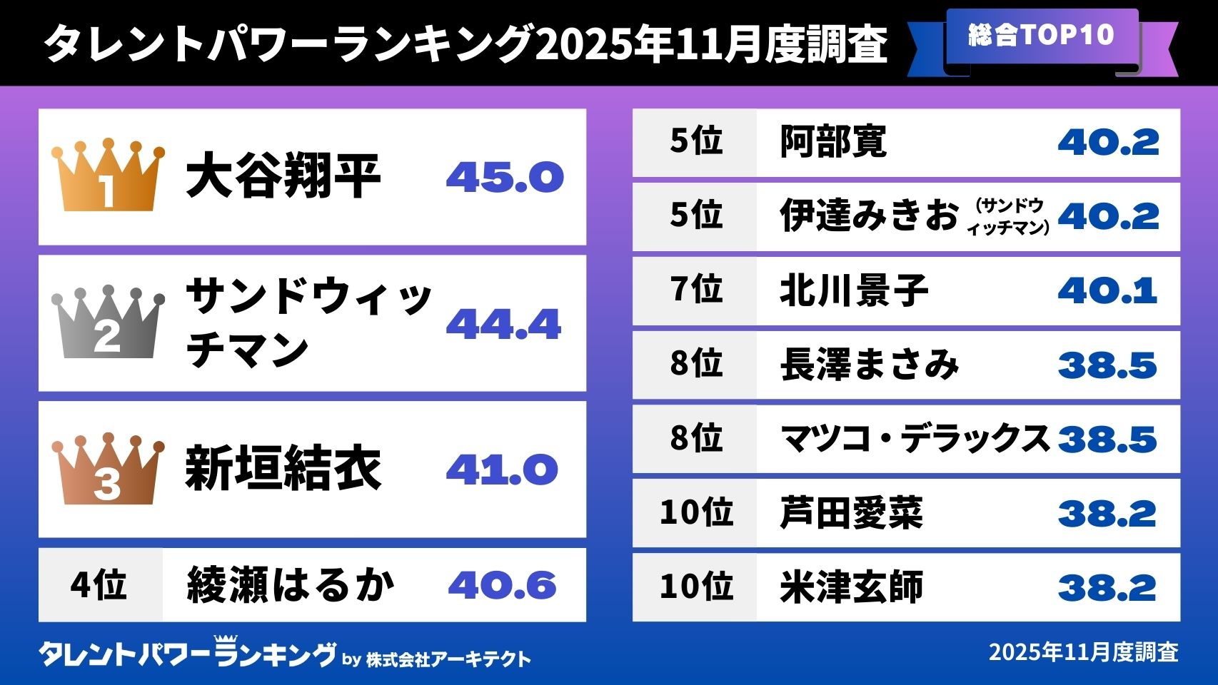 「タレントパワーランキング」2025年11月度調査(第4四半期)総合トップ10